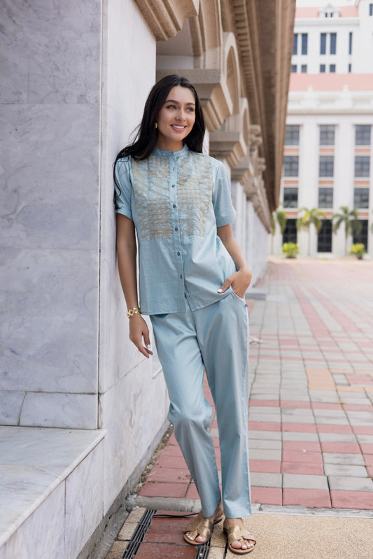 Roman Silk Embroidered Powder Blue Co-Ord Set